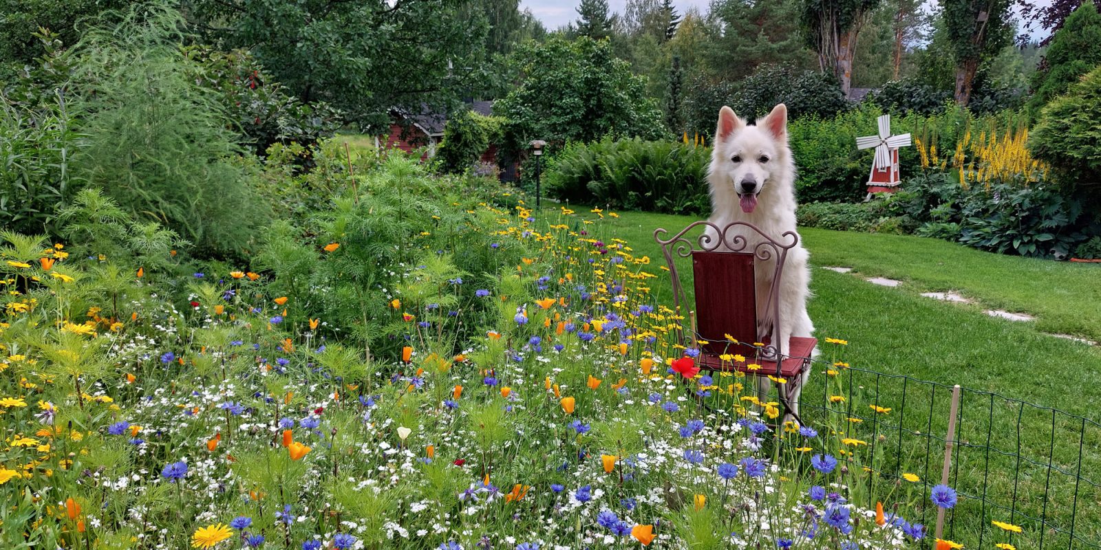 Betonikivirajaus ja -muurikivireunus antavat ryhtiä värikkäästi kukkivalle kesäiselle niitylle.