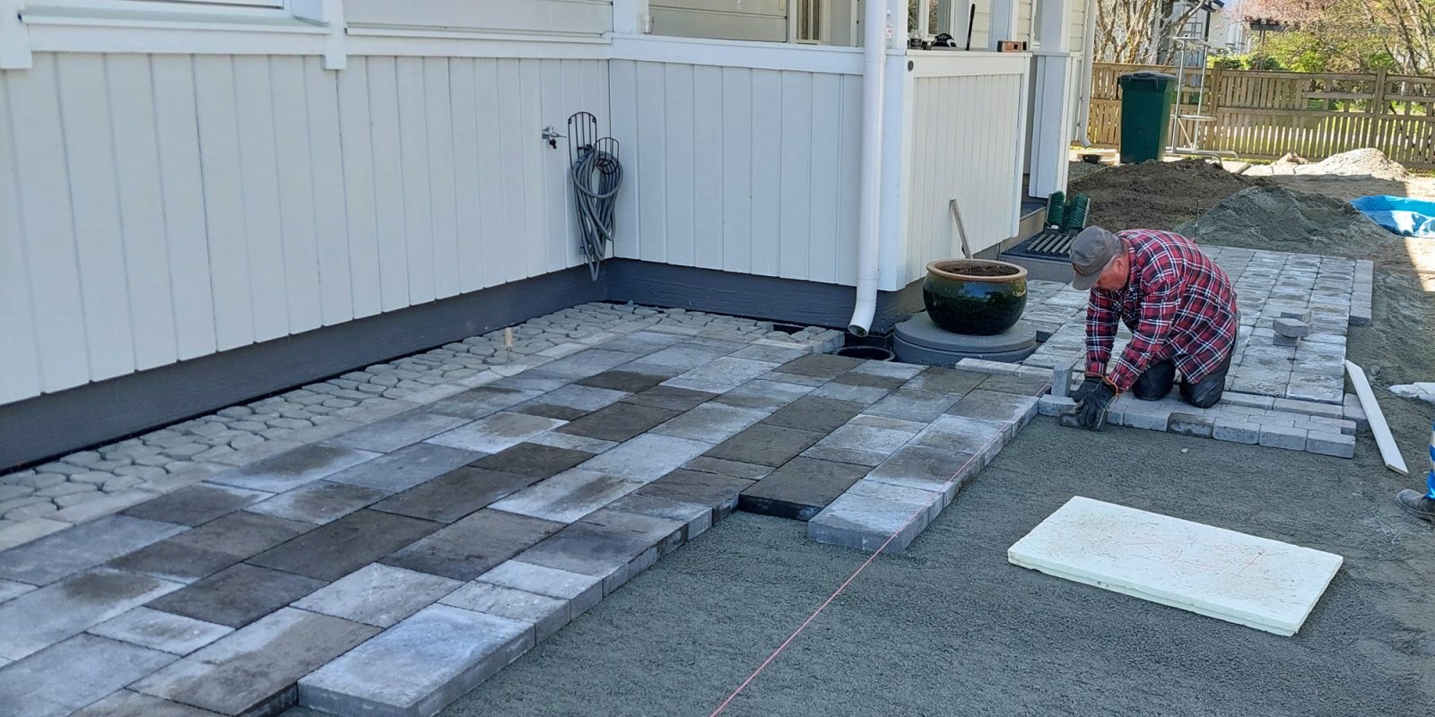 Rakennuksen sokkeliremontin sytytettyä kipinän kokonaisvaltaisesta puutarhan kunnostamisprojektista päivitettiin ensimmäisenä talon sisäänkäynti ja huoltopiha uuteen uskoon. Päätös oli myös kustannustehokas. Koneen myllätessä etupihan joka tapauksessa mullin mallin rakennuksen perustuksien esille kaivun yhteydessä, oli järkevää ulottaa kaivutyö samoin tein kattamaan myös kiveysten pohjaukset. Työn jouhevuutta edesauttoi etukäteen tehty piha-/kiveyssuunnitelma.
